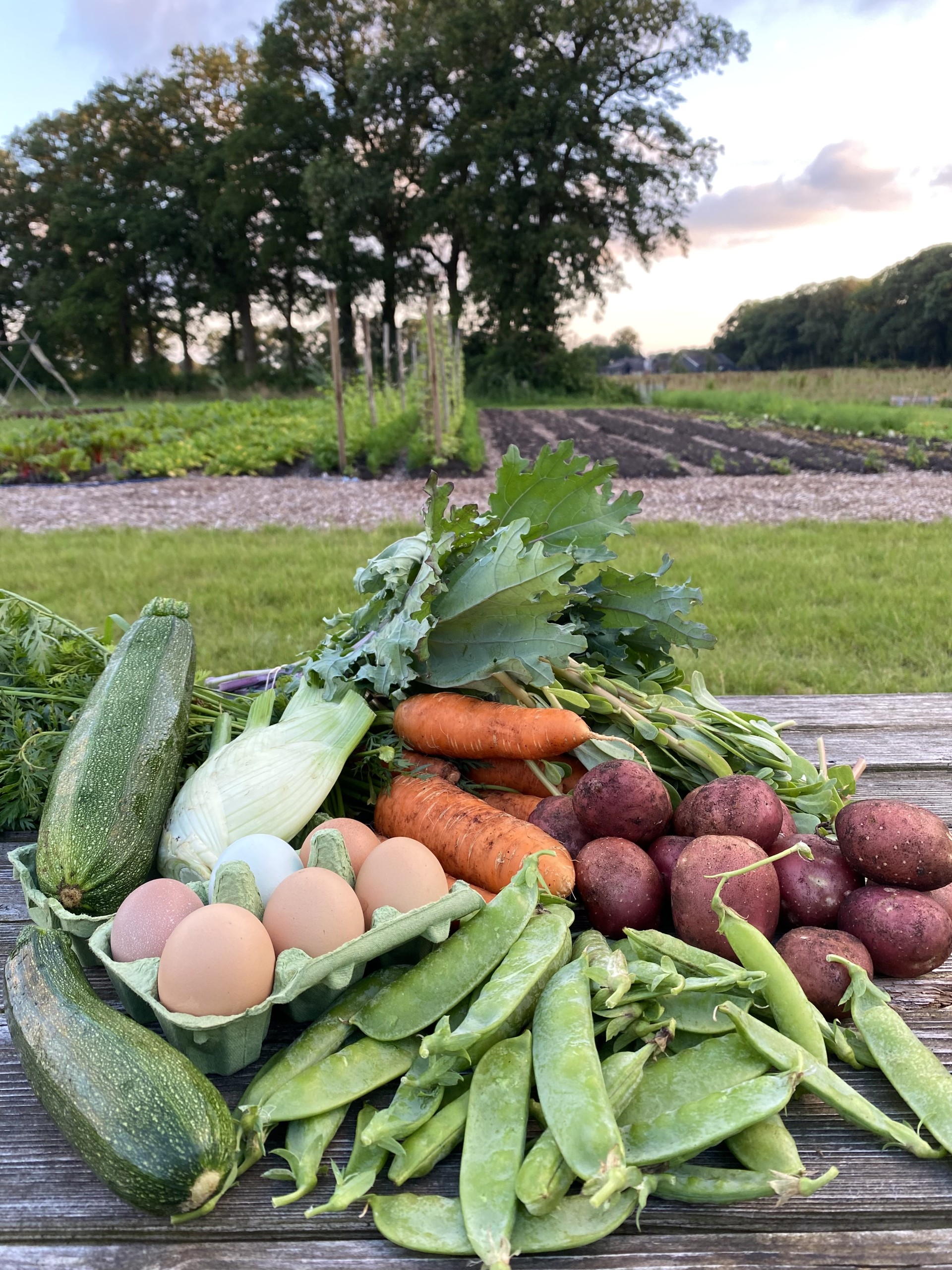 Voor de aan huis levering kun je kiezen uit een klein pakket (voor eenpersoonshuishouden) of een normaal pakket (voor twee personen / klein gezin), die je kunt aanvullen met 6 kakelverse eieren van onze blije buitenkippen. Elke week krijg je een mail met de pakketinhoud, updates van de boerderij en een handig recept.