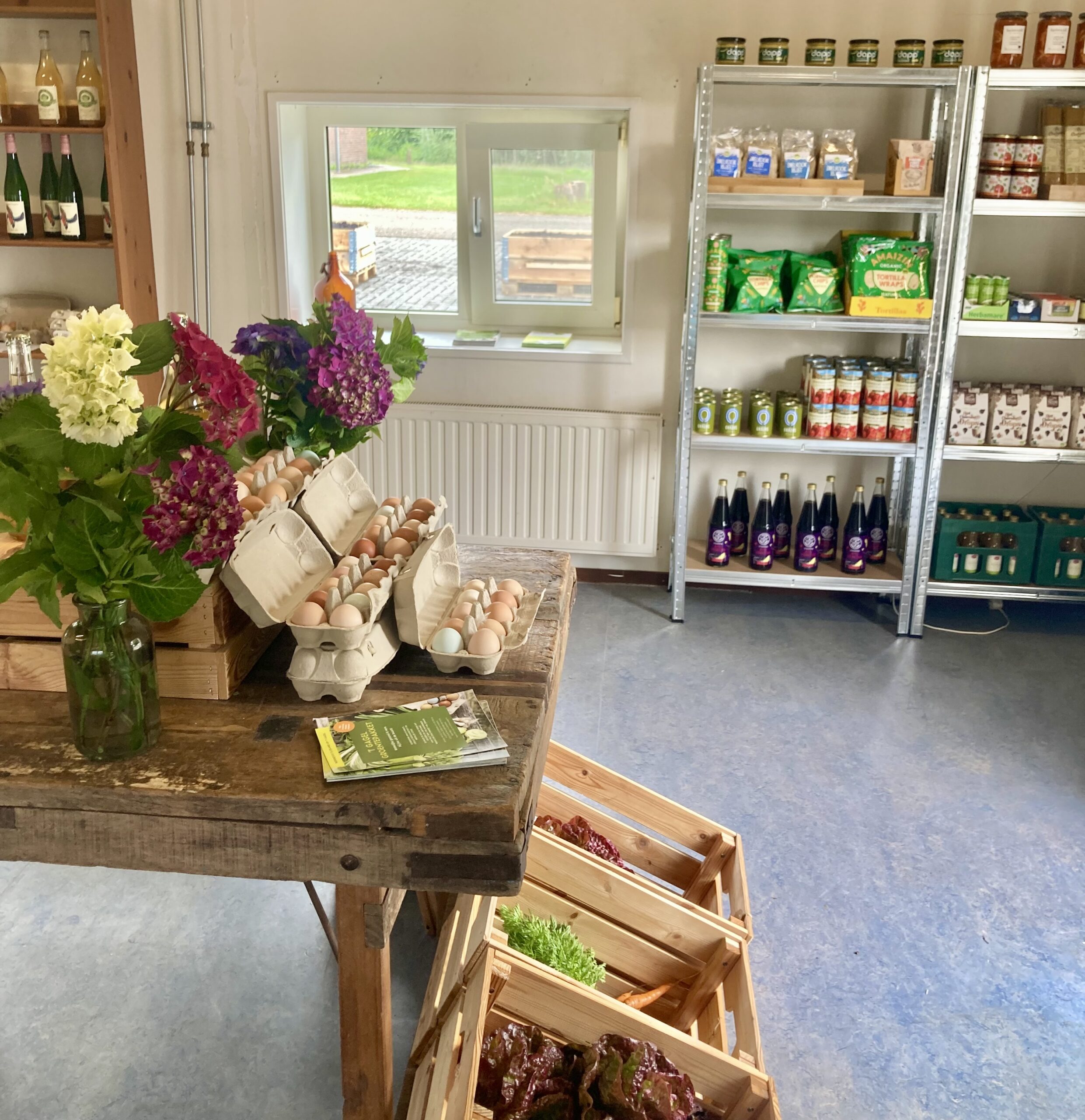In de winkel vind je onze (h)eerlijke verse eieren, verse oogst uit de no-dig tuin, zuivel van De Patrijs, biologische producten en lokale delicatessen.